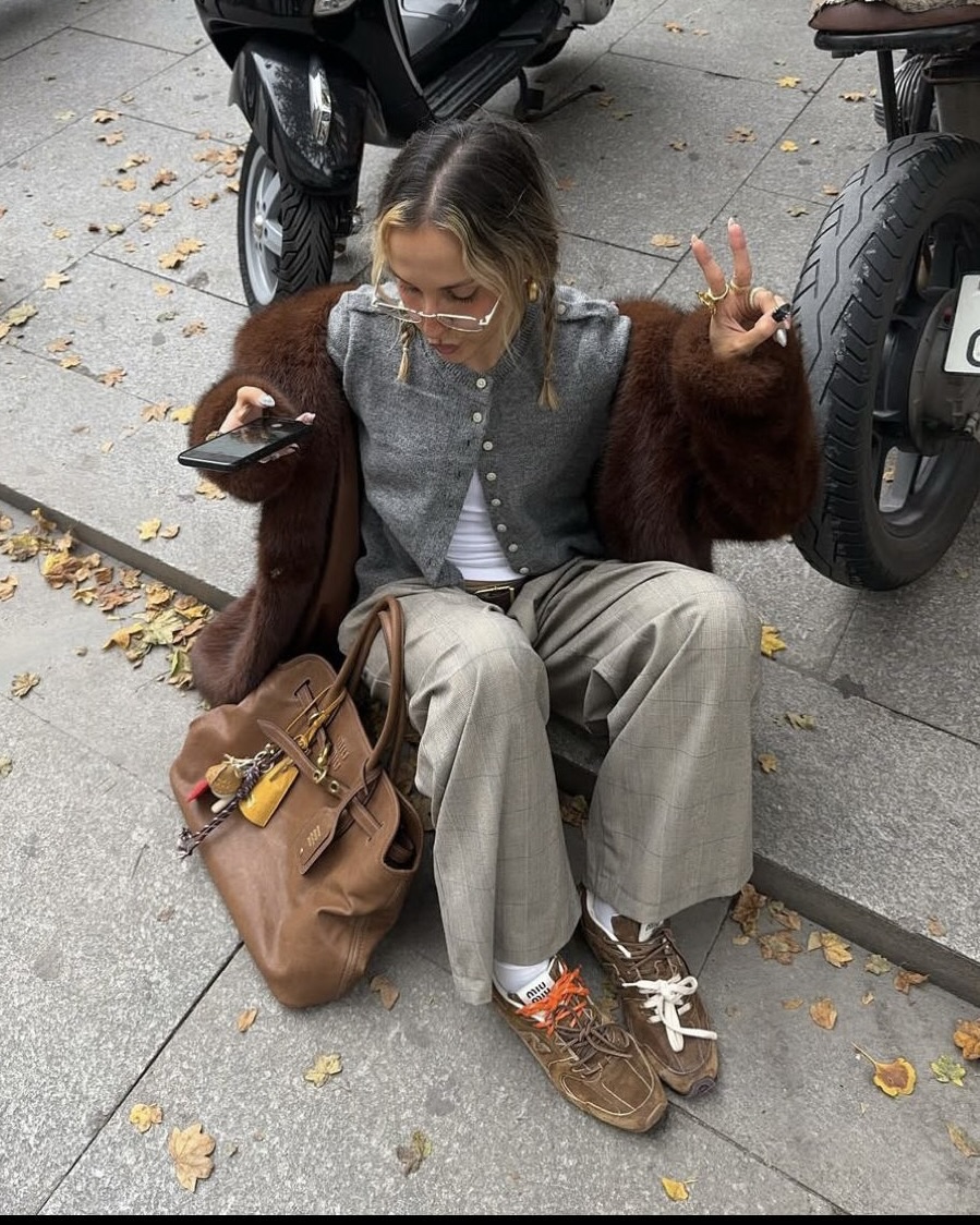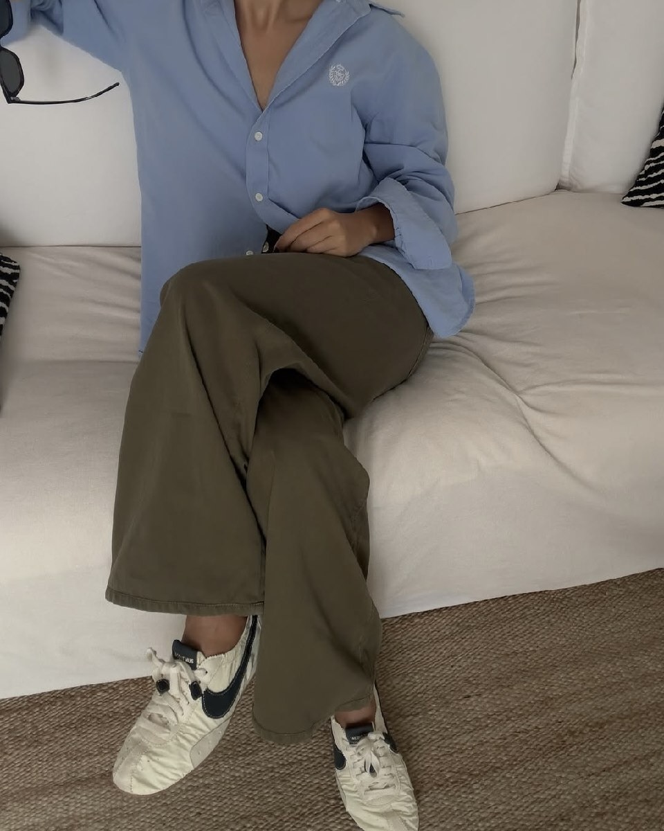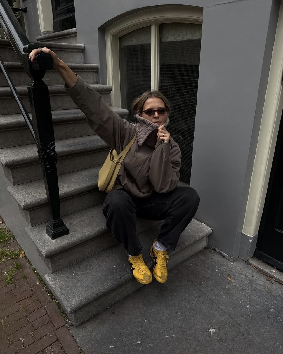 Нет, речь не про adidas Samba / Gazelle, эти модели уже надоели всем. Сейчас в моде низкие, часто текстильные ретро-кроссовки как на фото ниже. Брендовых вариантов полно: от самых популярных в прошлом квартале Jacquemus x Nike, до ярких Onitsuka Tiger Mexico 66. К таким кроссовкам подойдет буквально любой низ: и привычные джинсы или брюки и даже юбка.